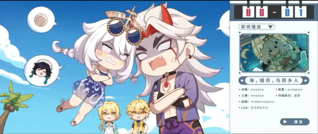 05:03 「夏末的细砂」OP——暗猫の祝福 06:48 「风神遇刺,封锁全场!度假酒店的悲剧!」过场动画——帷幕VMovie(主线开始) 09:28 「指南针」——BenAB 12:17 「温迪的剪辑妙妙屋」——利利那TD25 (整活向 推荐一看) 17:51 「临梦觉」——愚人戏社 21:09 「拯救大兵一斗」广告——中天Mifirma 23:51 「速递间奏曲」——-麦粒太太-Ver- 29:05 「让我们将全部铭刻于你的心间,伴你前行。」——渊渊的奇妙冒险 38:44 「旅行者日记.exe」——阿遥那家伙 (整活向,超多表情包素材 推荐一看) 56:23 「荧的漫长夏天」广告——SEVENA东泽 52:12 「伴风同行」——超想吃番茄 58:19 「枫丹怪盗传说-双子VS双子」——姬海棠羽笠果 1:01:55 「海,城市,与异乡人」Ukismeadow (画风可爱捏 推荐一看)2.